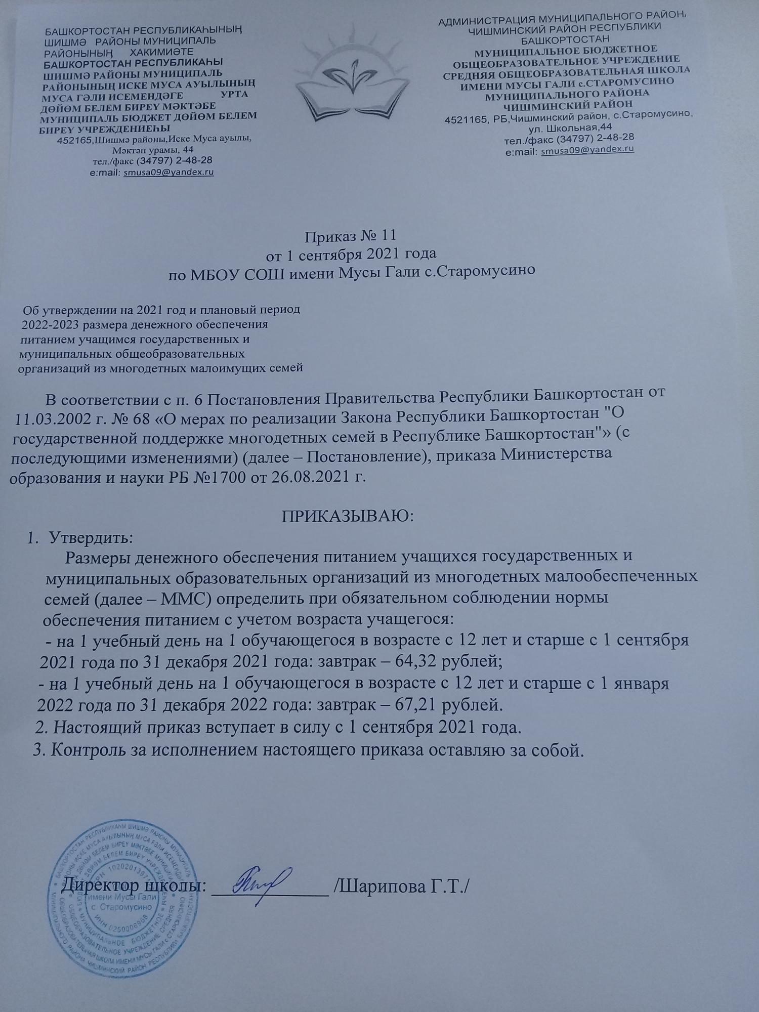 Организация питания в СОШ имени Мусы Гали с.Старомусино осуществляется ООО "Центр питания"